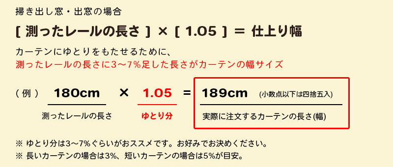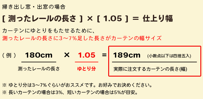 カーテンの幅と高さを決めます。取り付ける窓のカーテンレールを基準にします。