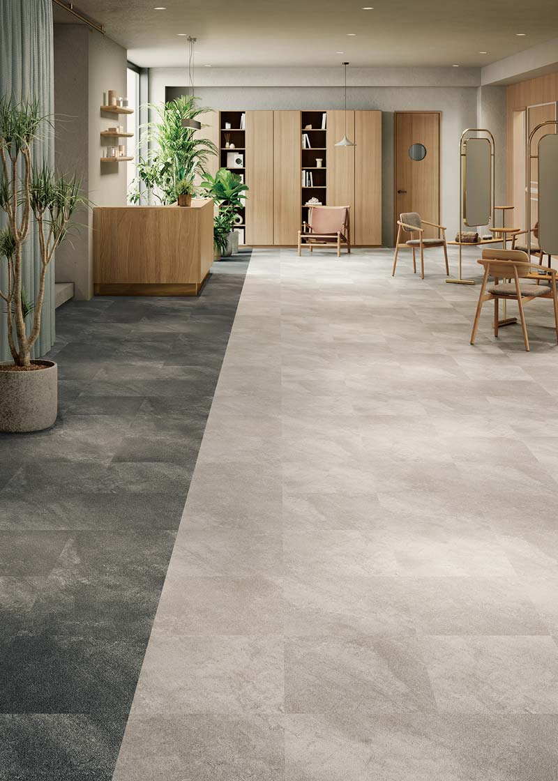 ● メンテナンス用樹脂ワックスを塗布する必要はありません。日常的にモップ、固く絞った雑巾などでヒールマークなどの汚れを取り除いてください。目地に沿った清掃をおすすめします。 ●「NW-EXシリーズ」は、製品の特性上、素足や靴下での歩行時に素材表面が引っかかることがあります。上靴、スリッパ履きで使用することをおすすめします。 ● 高耐久UV樹脂コーティングが摩滅してしまうため、ドライメンテナンスは行わないでください。 ● 若干寸法にバラツキがあります。施工の際にはご注意ください。 ● タイル一枚一枚の色柄に変化と濃淡があります。この不均一感が、仕上がったフロアにより一層の自然感をもたらします。同じ色調のタイルがかたよった場合は、部分的に差し替えることで違和感なく納まります。 ● タイル四辺に光沢が異なる部分があります。 |