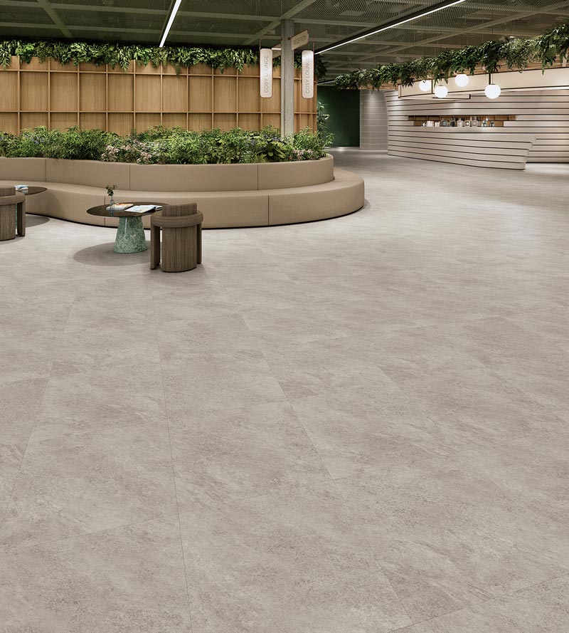 大胆な石の表情と濃淡の抑揚を600㎜角でデザイン。大らかな動きのある模様は、大きな空間にも使いやすく落ち着きのある雰囲気を演出します。