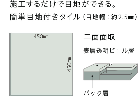 サイズ : 450㎜ × 450㎜ 全 厚 : 3.0㎜厚 表層透明ビニル層0.3㎜ 14枚入 / 2.83㎡ / ケース