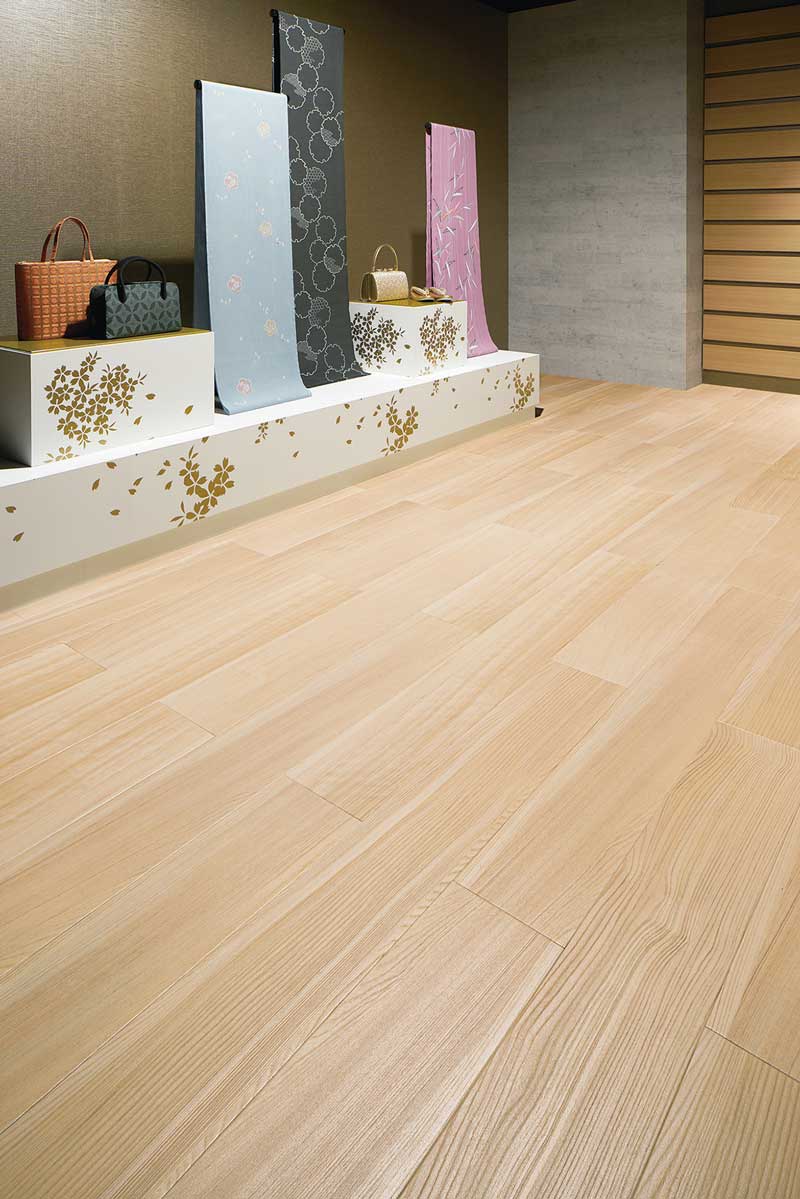 美しい光沢と優しく上品な雰囲気が特長の日本固有種。辺材の白、芯材の薄ピンクなど檜の繊細な色変化を活かしたデザインです。