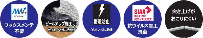 ※ タイル間の柄合わせはできません。 ※ 四面面取の面取り部分には高耐久UV樹脂(EX仕様)コーティング等の制電性能(人体耐電圧1kv以下)を有しています。 ※ 建物の出入り口には、汚れがキズに入り込んでしまい、汚れ落ちが悪くなります。土砂の持ち込みの可能性がある路面に面した部位で使用される場合は、除塵性の高いマットをできるだけ広い面積で設置してください。 ● メンテナンス用樹脂ワックスを塗布する必要はありません。日常的にモップ、固く絞った雑巾などでヒールマーク等の汚れを取り除いてください。目地に沿った清掃をおすすめします。 ● 高耐久UV樹脂コーティングが摩滅してしまうため、ドライメンテナンスは行わないでください。 ● 取れにくい汚れには中性洗剤を使用してください。 ●「NW・EXシリーズ」はワックス液をはじいてしまうため、ワックス塗布には指定の前処理が必要になります。 |
