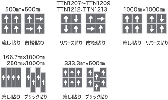 ● 施工の際はタイル裏面の矢印で流れ方向をご確認ください。 ● 二重床表面仕上げ材として使用する場合は、下地パネルとルースレイタイルの目地を半分又は1/3程度ずらして施工します。(またぎ貼り・1/2スライド工法または1/3スライド工法) ● 室温10℃以上での施工をおすすめします。 ● 室温15℃以下では、タイル間に名刺一枚分の隙間を空けて施工してください。 ● 下地に段差・隙間・凸凹のある場合、その程度によってタイル表面に目立って現れる場合があります。 ● 下地追従タイプのフリーアクセスフロアに施工する際は、パネルの傾きにより目地段差が生じる場合があります。施工前にフリーアクセスフロア(下地)が平滑であることをご確認ください。 ※ 接着剤のご案内はページ下部にございます。 |