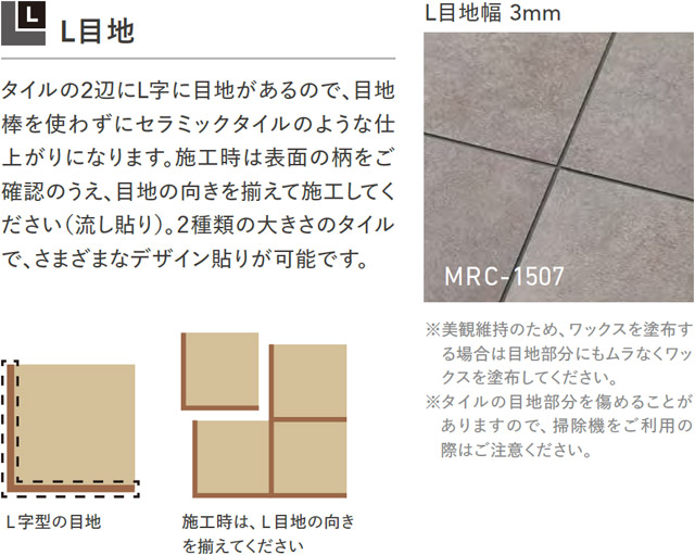 ※タイルの2辺にL字に目地があります。目地棒を使わず目地施工のような仕上がりになります。